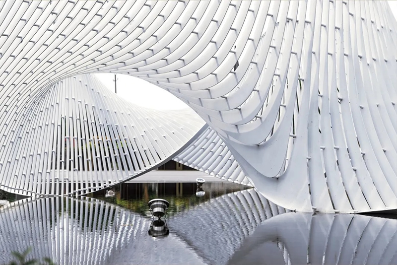 雕塑設置在水景之上,設計師在構思設計之前對有限的空間和特殊的地理條件進行思考和推敲。結合“綢都”蘇州的本土文化特征,提取“絲綢”和“水鄉”作為抽象設計語言,打造出柔美靈動的藝術作品。