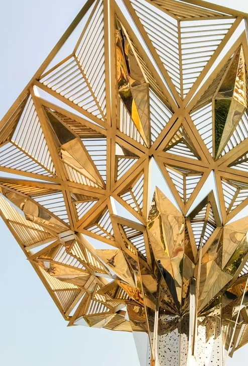 利用折面呈現多棱角反射周圍的景觀環境,呼應開放多元化的文化氛圍,巧妙重組了現代裝置材料,以通體鏡面解構并呈現了空間,更將原空間的靈動、雅致進行再次詮釋衍射,鏡面映照出熙熙攘攘川流不息的過路者,為鏡面中所反射的景象增添了動感和變化。身置其中,仿佛得到了片刻的寧靜,燈火輝煌,正是一道亮麗的風景線。